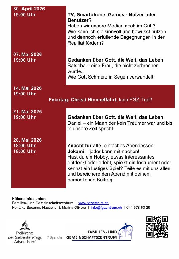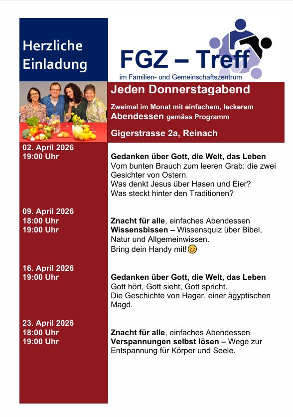Schön, dass du vorbeischaust. Das Familien- und Gemeinschaftszentrum Reinach-Wynental (FGZ) ist eine Initiative engagierter Siebenten-Tags-Adventisten aus dem Oberen Wynental und Umgebung. Unser Ziel ist es, mit unseren Angeboten die Familie und Gemeinschaft wieder ins Zentrum unseres Lebens zu rücken. Viel Spass beim Erkunden unseres Internetauftrittes.