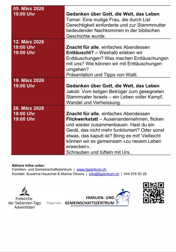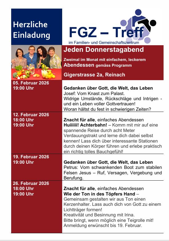 Schön, dass du vorbeischaust. Das Familien- und Gemeinschaftszentrum Reinach-Wynental (FGZ) ist eine Initiative engagierter Siebenten-Tags-Adventisten aus dem Oberen Wynental und Umgebung. Unser Ziel ist es, mit unseren Angeboten die Familie und Gemeinschaft wieder ins Zentrum unseres Lebens zu rücken. Viel Spass beim Erkunden unseres Internetauftrittes.