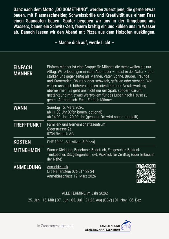Ganz nach dem Motto „DO SOMETHING“, werden zuerst jene, die gerne etwas bauen, mit Plasmaschneider, Schweissbrille und Kreativität aus einem Fass einen Saunaofen bauen. Später begeben wir uns in der Umgebung ans Wassers, bauen ein Schwitz-Zelt, feuern kräftig ein und kühlen uns im Wasser ab. Danach lassen wir den Abend mit Pizza aus dem Holzofen ausklingen.